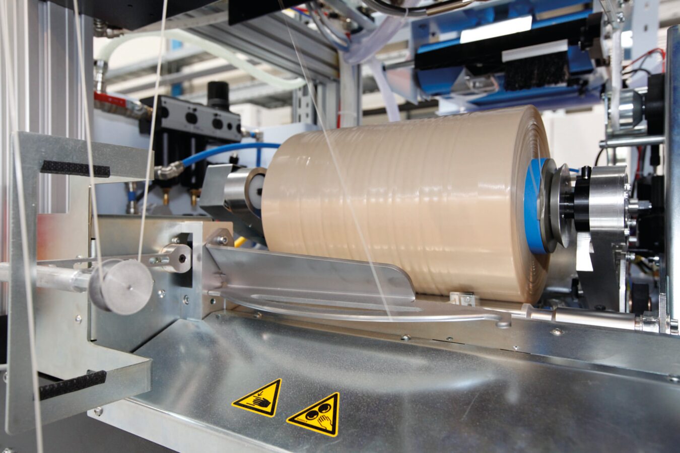 Weiterer Pluspunkt: Mit zwei Parkpositionen für Vollspulen kommt auch die Anlagenkonfiguration für Teppichgrundgewebe 24 Stunden ohne Spulenwechsel aus, was den Schichtbetrieb erleichtert. Zudem reduzieren gleiche Lauflängen der Spulen, die in einem automatischen Wickelkonzept üblich sind, den Abfall. In Verbindung mit der EvoTape Anlage eröffnen sich noch weitere Vorteile des neuen Präzisionswicklers: Beim Spulenwechsel entstehender Produktionsabfall kann direkt wieder dem Extruder zugeführt werden.