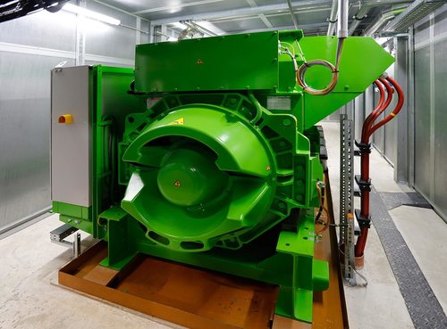 Das Herzstück des BHKW: Mit einem gasbetriebenen Verbrennungsmotor wird ein Generator angetrieben, der die durch den Motor erzeugte Bewegungsenergie in Strom umwandelt.