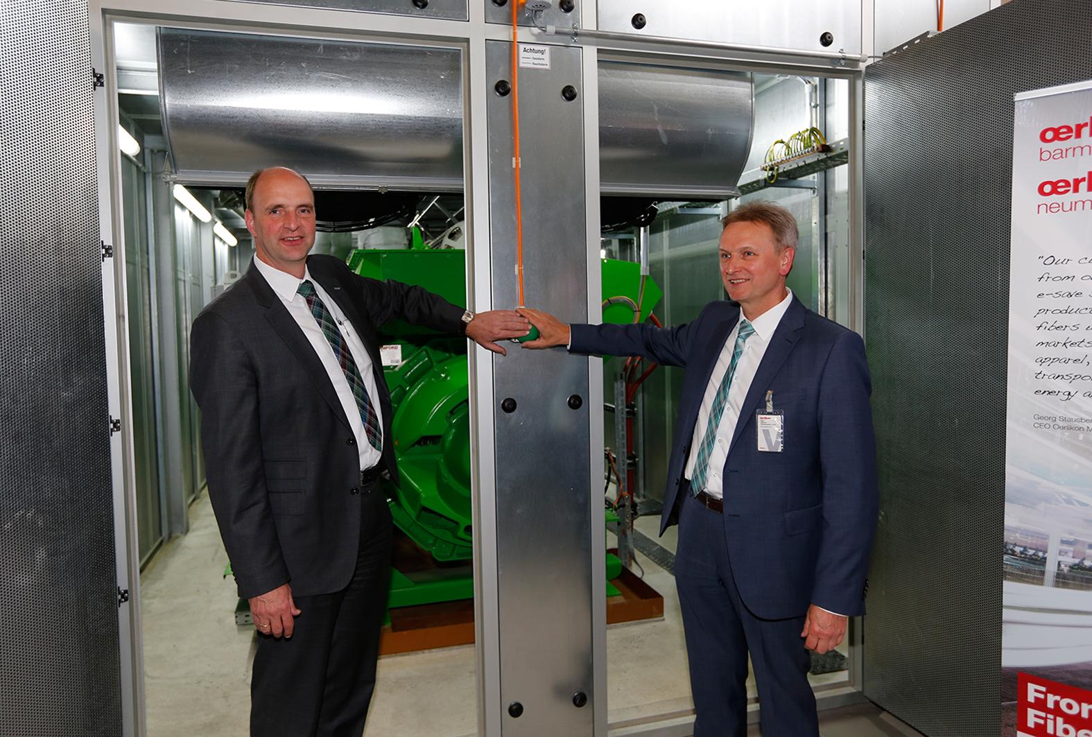Remscheid, 10. Mai 2016 – Nach einer rund 7-monatigen Planungs- und Bauphase nahm der Remscheider Maschinen- und Anlagenbauer Oerlikon Barmag heute sein neues Blockheizkraftwerk (BHKW) in Betrieb. Im Beisein des Kooperationspartners GELSENWASSER AG legte Oerlikon Barmag Geschäftsführer Georg Stausberg gemeinsam mit dem Bereichsleiter Dezentrale Energieerzeugung bei der GELSENWASSER AG, Bernhard Albers, am heutigen Dienstag den Schalter um. Damit wird das Gelände an der Leverkuser Straße fortan mit Energie aus innovativer Technologie versorgt.