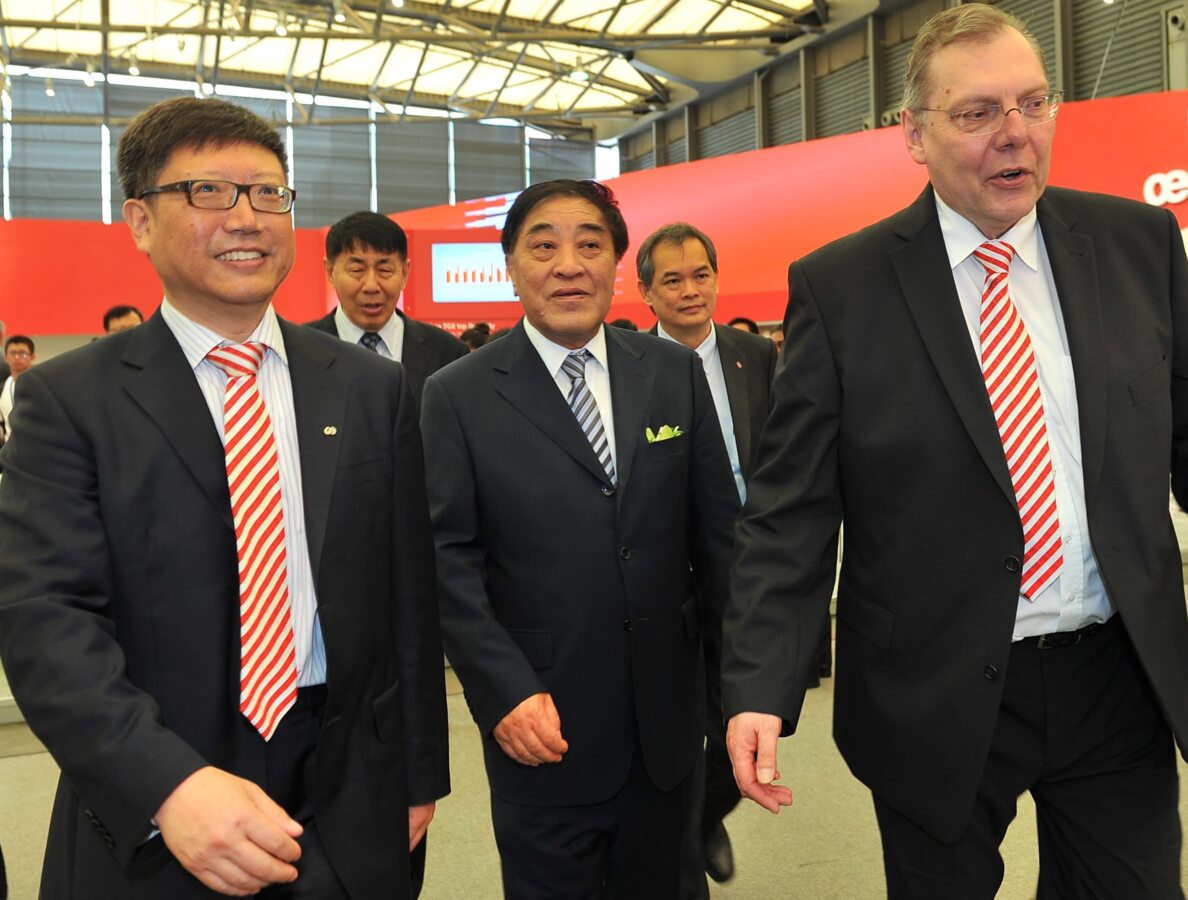 Bild 1: Wang Tiankai, Präsident der CNTAC (Mitte), besuchte 2012 den Oerlikon-Stand zusammen mit dem CEO von Oerlikon Manmade Fibers, Stefan Kross (rechts) und dem Präsidenten von Oerlikon China, Wang Jun (links).